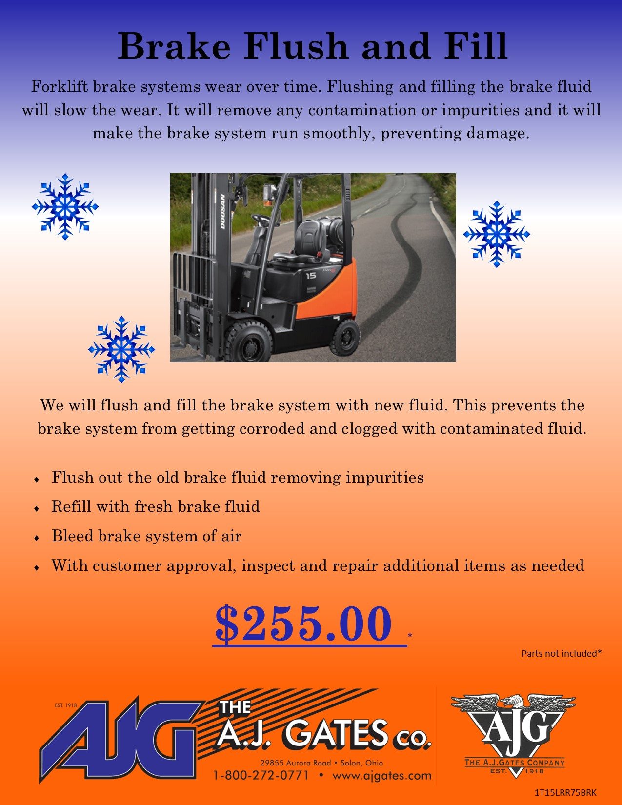Specials Check out our current specials covering products and services. If you are interested in additional information, please call us at 440-498-0123 or click below to see our flyers! Summer Special: Brake Flush and Fill View Details Winter Special: Hydraulic Flushing View Details Winter Special: Brake Flush and Fill View Details Winter Special: Analyzing Exhaust Emissions View Details Winter Special: Brake System View Details Winter Special: Power washing and painting View Details Winter Special: Changing the Antifreeze View Details Winter Special: Forklift Winterize Special View Details